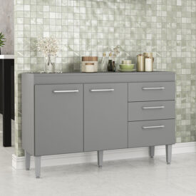 Materialidad: MDP Espesor: 12 y 15 Color: GRIS Largo: 120,8 CM Ancho: 37 CM Alto: 77,5 CM Peso: 28,09 Kg Cant Puertas: 3 Cant Cajones: 2 Materialidad manillas: PLASTICO Dificultad Armado: Facil