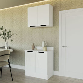 Fabricada en materiales de alta resistencia y con un acabado beige mate, combina durabilidad, elegancia y practicidad. Sus puertas abatibles con sistema de apertura suave y sus patas elevadas facilitan la limpieza y aportan estabilidad al mueble.