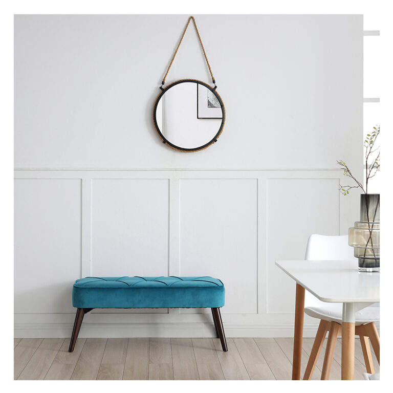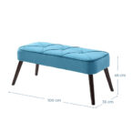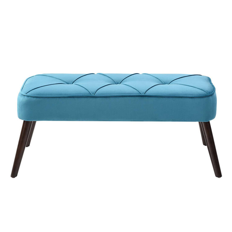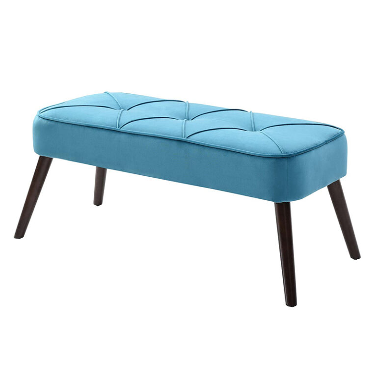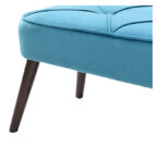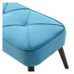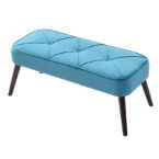 Banca color turquesa, su material de relleno es espuma, su tela es terciopelo y el material de sus patas es metal