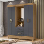 Closet fabricado en aglomerado MDP con terminación en pintura UV acabado símil madera y color Grafito. Posee 4 puertas y 2 cajones, con manillas de pvc color champagne y en su interior 2 barras para colgar además de una repisa. Incluye 4 patas que le dan altura y además facilitan la limpieza del piso. Visible al exterior, tendrás un espejo con 2 compartimentos para dejar a mano las cosas que utilizas a diario o decoración para personalizar tu closet.