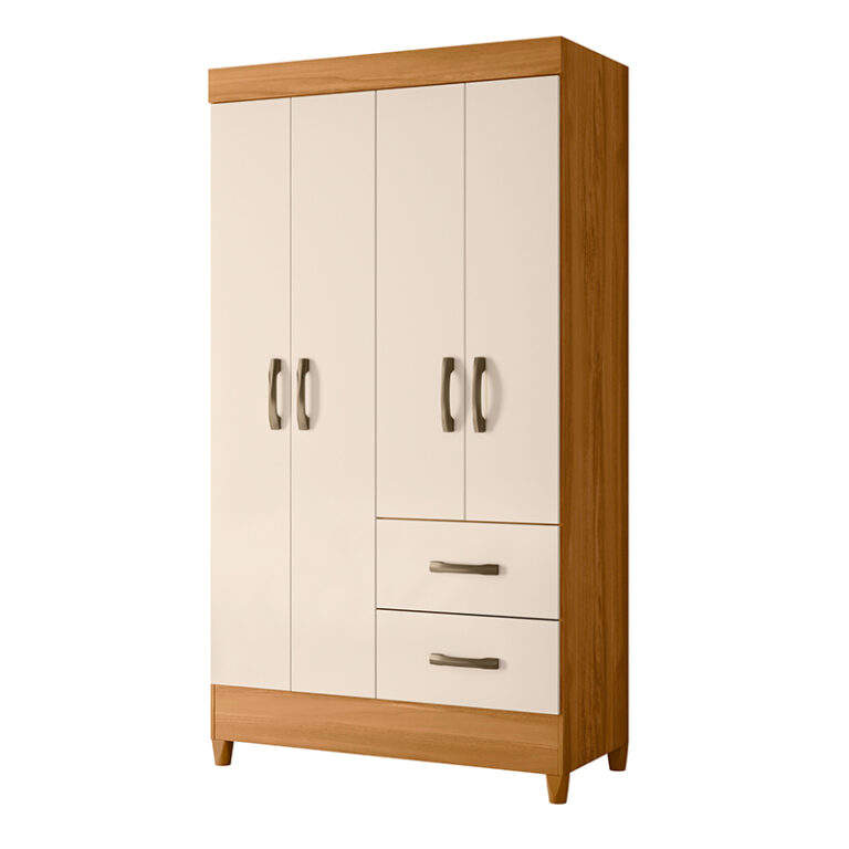 Closet fabricado en aglomerado MDP con terminación en pintura UV. Posee 4 puertas y 2 cajones y en su interior 2 barras para colgar, además de un espacio para zapatos. Incluye 4 patas que le dan altura y además facilitan la limpieza del piso, de tamaño ideal y estilo sofisticado para mantener en orden tu dormitorio.