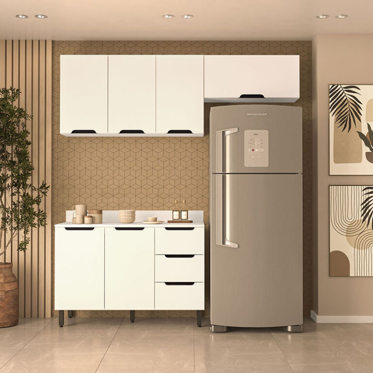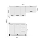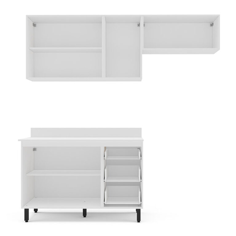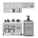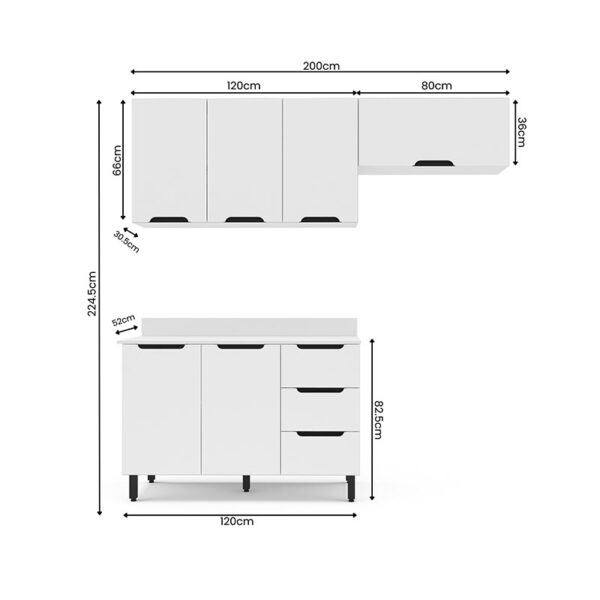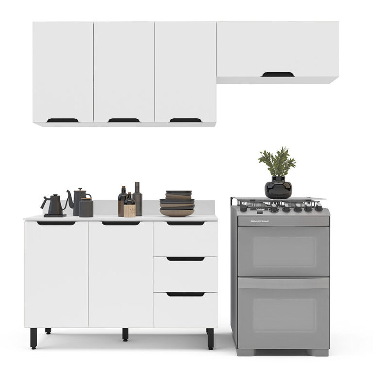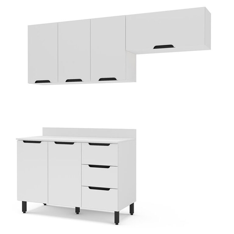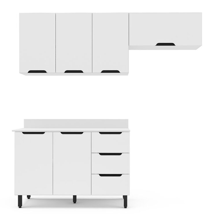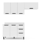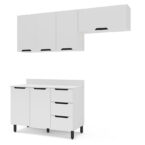 Incluye tres muebles aéreos con puertas abatibles y un mueble base de dos puertas y tres cajones, ideales para guardar utensilios, vajilla o alimentos. Su estructura en material resistente, con tiradores negros integrados y patas regulables, garantiza durabilidad y un estilo moderno.