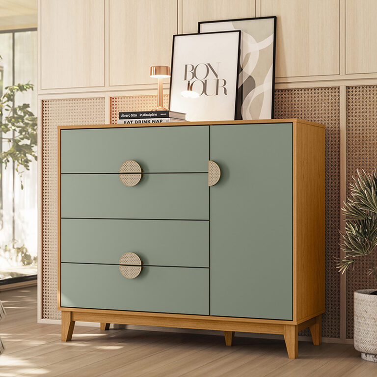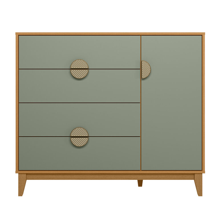 La Cómoda Ipe Salvia 1p y 4c Vekka es un mueble moderno y elegante que se adapta a cualquier estilo de decoración. Con una altura de 101 cm, ancho de 120 cm y profundidad de 47 cm, ofrece un amplio espacio de almacenamiento. Cuenta con 4 cajones de MDP y 1 puerta con correderas telescópicas de metal para un fácil acceso. Además, incluye 5 estantes para organizar tus pertenencias de manera ordenada.