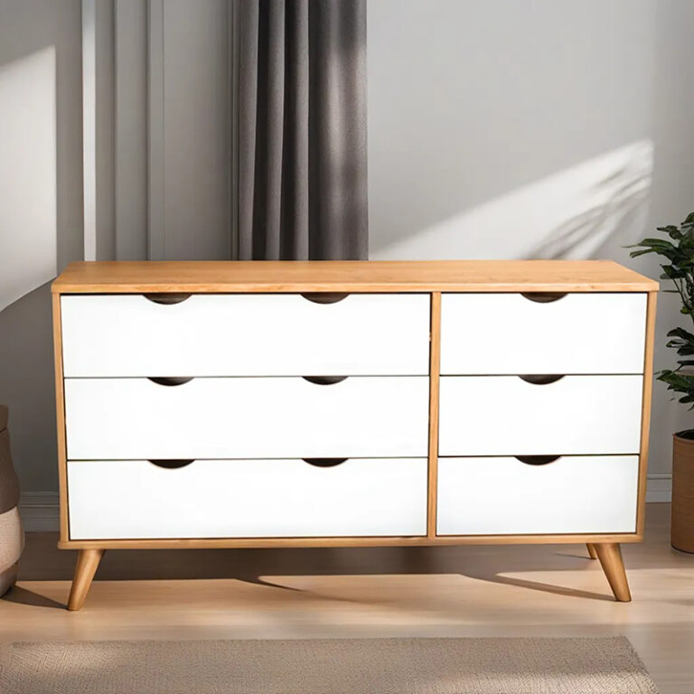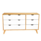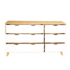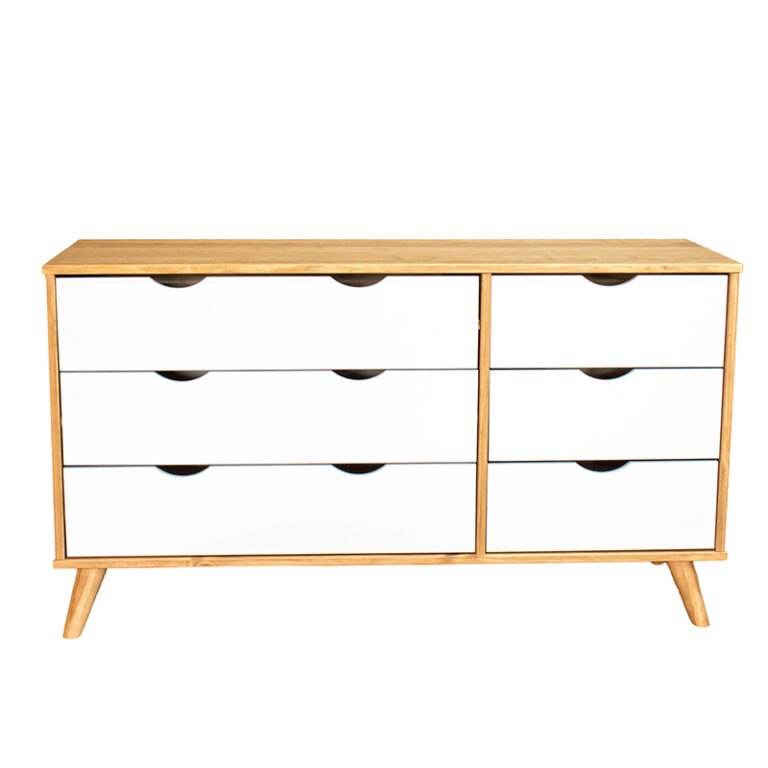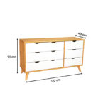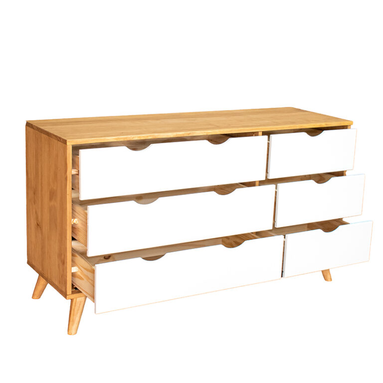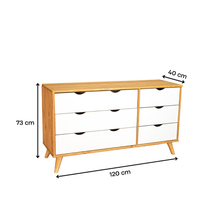 La cómoda Luna de la marca VEKKA es un mueble de alta calidad fabricado en madera maciza de pino, lo que garantiza durabilidad y resistencia. Con 6 cajones de madera de pino y correderas de madera, ofrece un amplio espacio de almacenamiento para organizar tus pertenencias de manera eficiente. Su diseño elegante y moderno, con una altura de 73 cm, ancho de 120 cm y profundidad de 40 cm, se adapta perfectamente a cualquier estilo de decoración en tu hogar.
