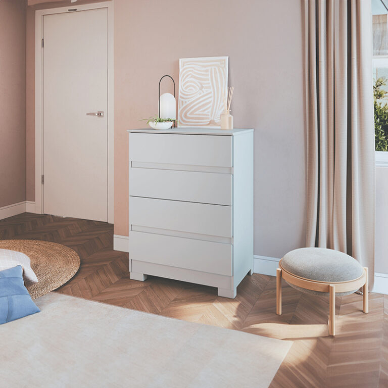 Cómoda Maia 4 cajones, estrucutra en MDP, cubierta en Pintura UV y patas en ABS. Es ideal para no usar un espacio gigante, pero tener buena capacidad de organización. Aparte tiene un dieseño fácil de combinar en cualquier habitación