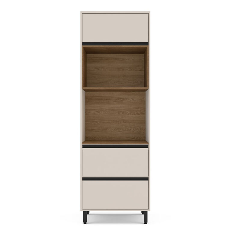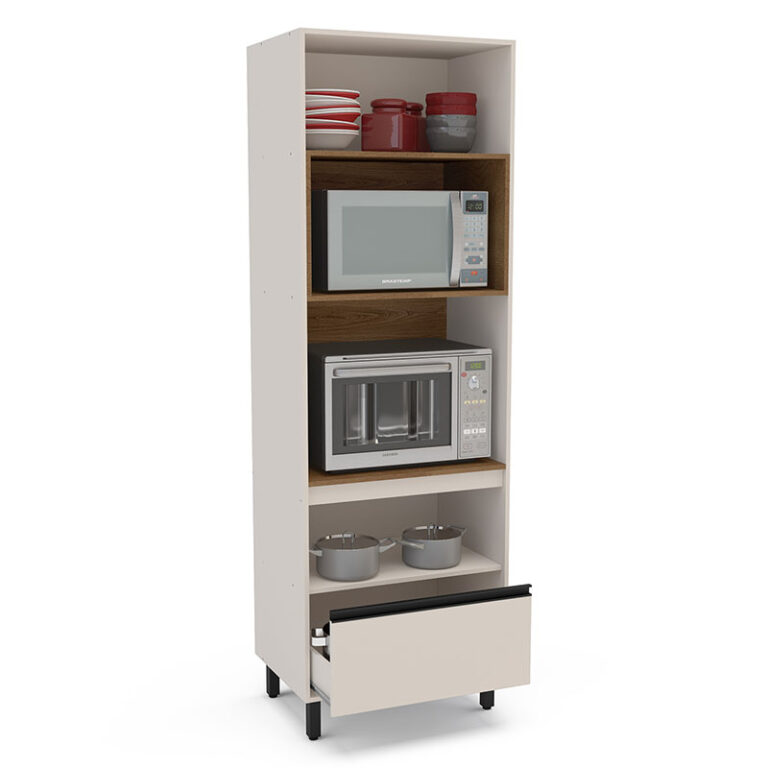 Optimiza tu espacio con este mueble de cocina multifuncional de diseño moderno y práctico. Con una altura total de 244 cm, ofrece amplios compartimientos distribuidos estratégicamente para adaptarse a electrodomésticos como hornos o microondas, así como utensilios y accesorios de cocina.