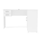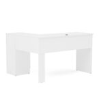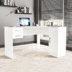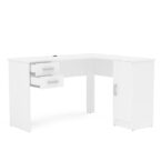 Escritorio esquinero Barcelona fabricado en aglomerado MDP color blanco. En sus costados cuenta con 2 cajones, 1 puerta y 3 manillas de plástico. Diseñado para entregar orden y funcionalidad para sus espacios de trabajo o estudio.