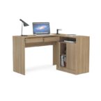 Escritorio esquinero fabricado en MDP con terminación símil madera. Posee dos cajones y un espacioso compartimiento con 2 puertas y repisa interior. Perfecto para quienes necesitan espacios amplios a la hora de trabajar, ya que su cubierta es extensa y sus compartimientos permiten organizar todos los artículos de oficina de manera ordenada.