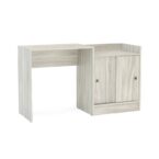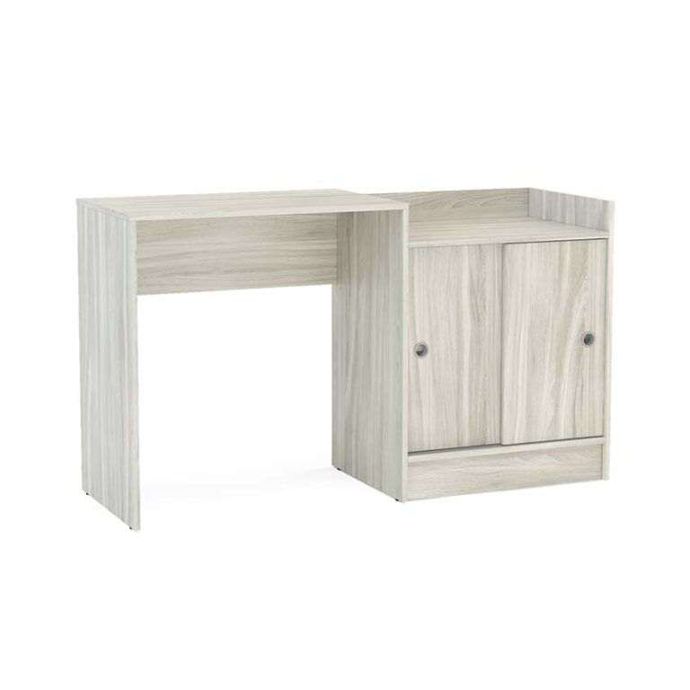 Escritorio fabricado en MDP con terminación en pintura UV, lo que le otorga un acabado símil madera. La cubierta posee dos niveles y cuenta con un compartimiento con puertas correderas y repisa interior. Es un escritorio práctico, ideal para mantener la organización y orden en el espacio de trabajo.