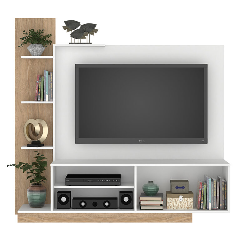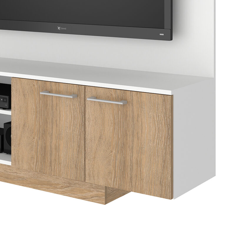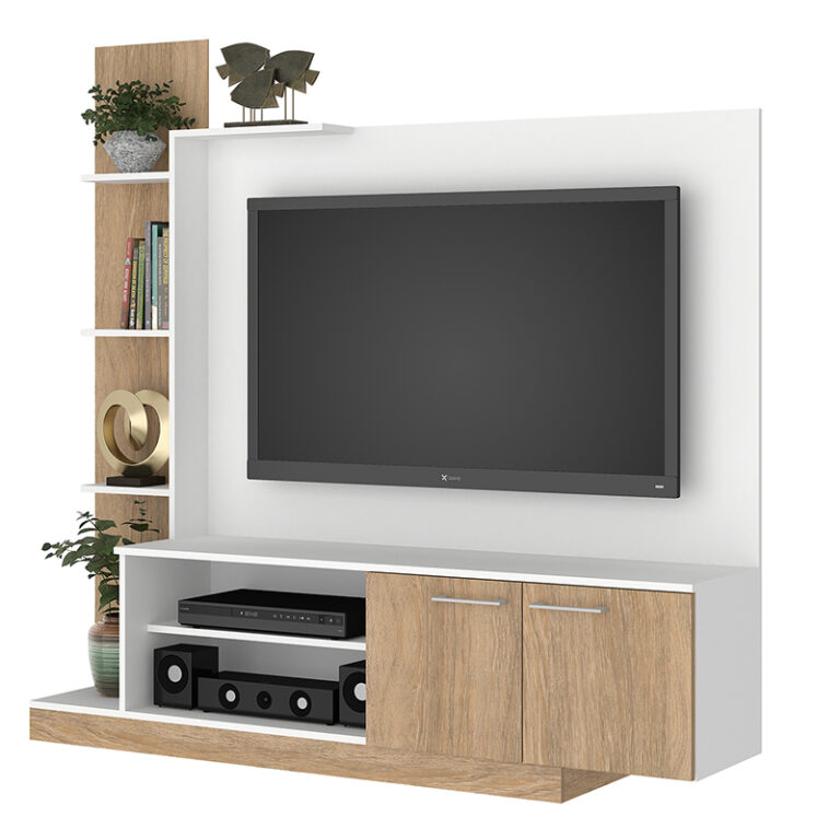 Home TV de estructura de MDP color café para TV de 55”. Cuenta con 2 puertas, además de múltiples repisas y compartimientos para mayor funcionalidad.