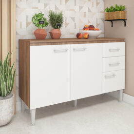 El diseño incluye módulos superiores e inferiores, cajonera y una columna vertical cerrada para almacenar utensilios, alimentos y objetos esenciales. Su distribución permite organizar fácilmente el espacio, manteniendo todo siempre a mano para hacer más cómoda la rutina diaria.
