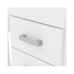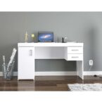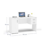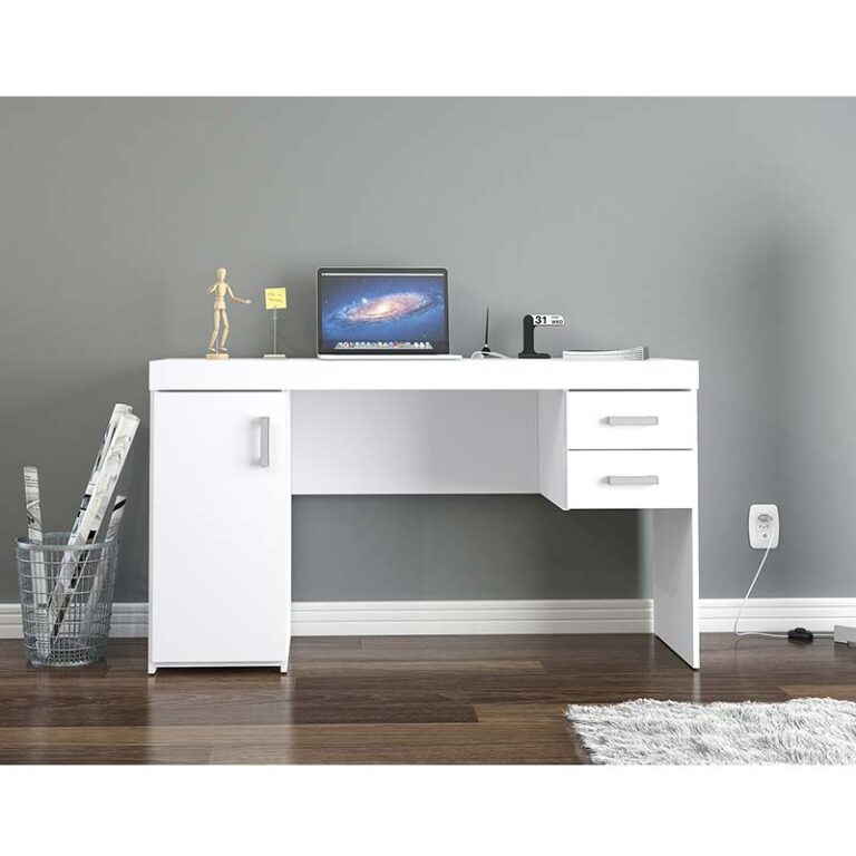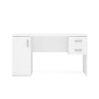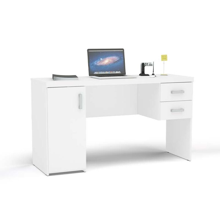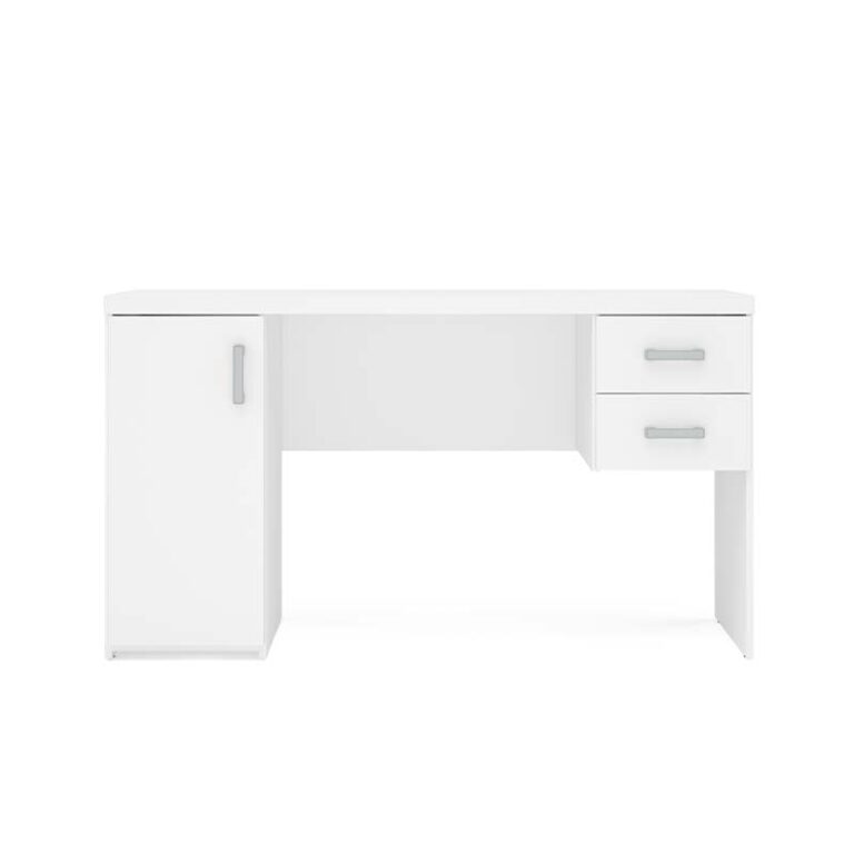 Escritorio fabricado en aglomerado MDP con terminación en pintura UV color blanco. Posee una puerta con bisagras metálicas y repisa interior, dos cajones con correderas metálicas y tres manillas de PVC, siendo un escritorio clásico e ideal para quienes necesitan múltiples compartimientos para mantener organizado y en orden el espacio de trabajo.