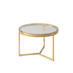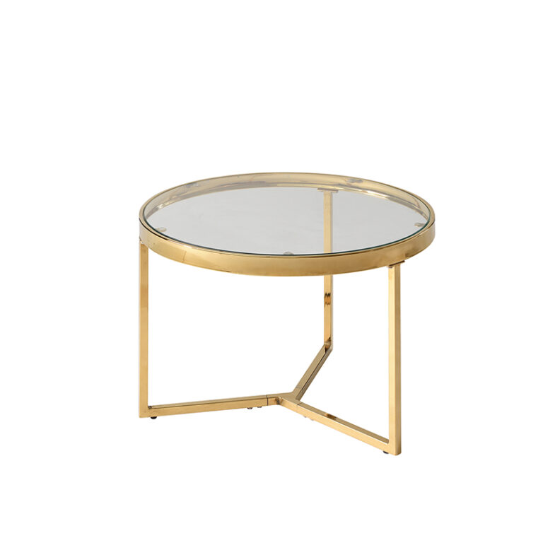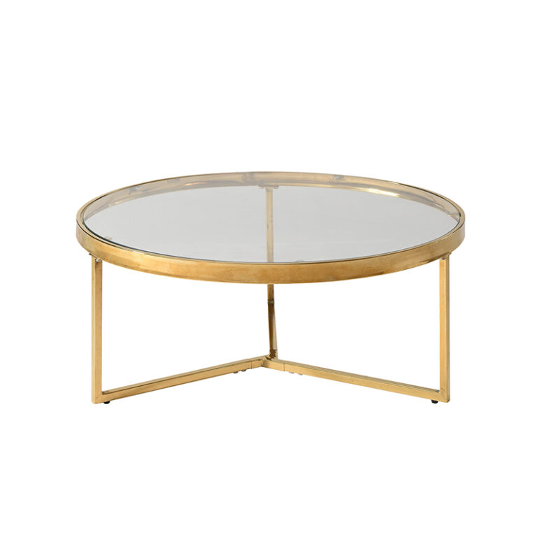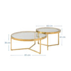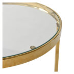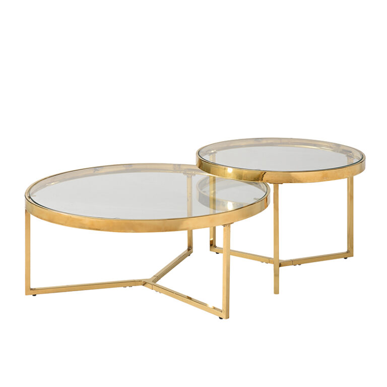 Conjunto de mesas de centro de estructura metálica en color dorado y cubierta de vidrio. Su diseño es prolijo y sofisticado, perfecto para otorgar un toque elegante y realzar la belleza de espacios del hogar, como el living.