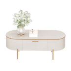 La Mesa de Centro Selena Beige combina diseño ovalado moderno y funcionalidad con almacenamiento integrado. Perfecta para living contemporáneo que busca elegancia y organización.