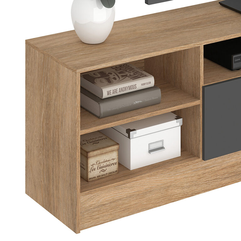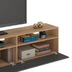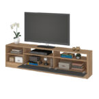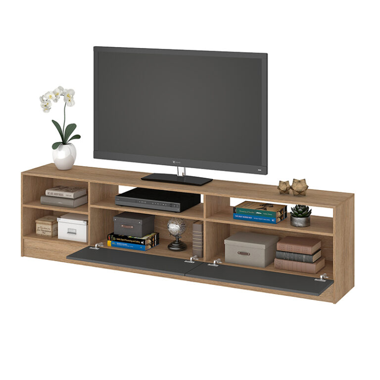 Rack Moyan de estructura en MDP con terminación en pintura UV de acabado símil madera. Capacidad para televisores de hasta 75″, posee 2 puertas abatibles y 4 compartimientos a la vista, para poder organizar todos tus complementos de tv y decoración para darle estilo y a tu sala de estar.