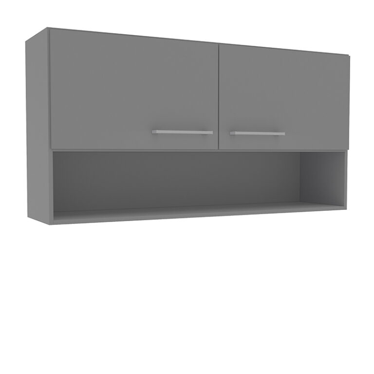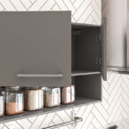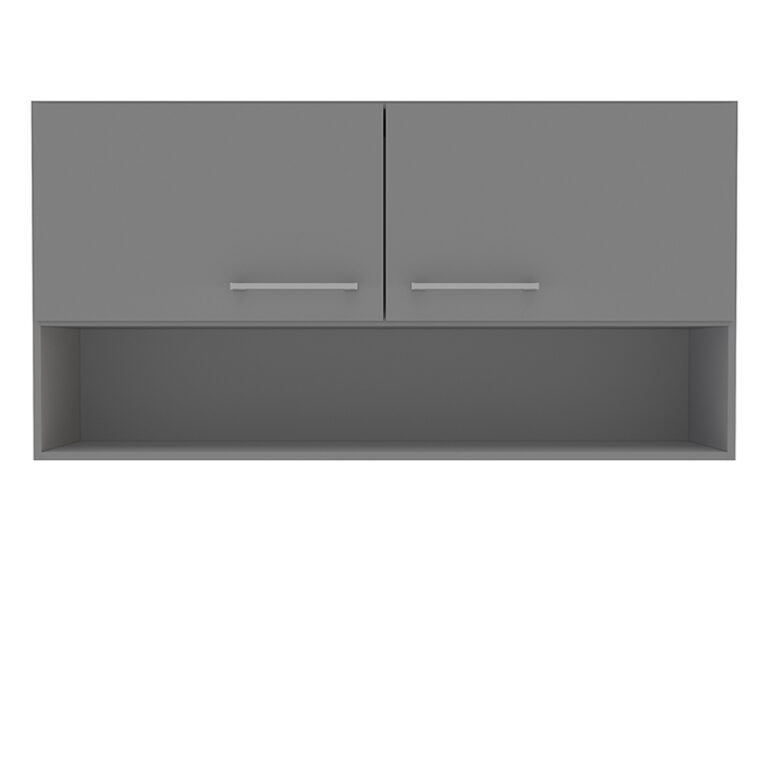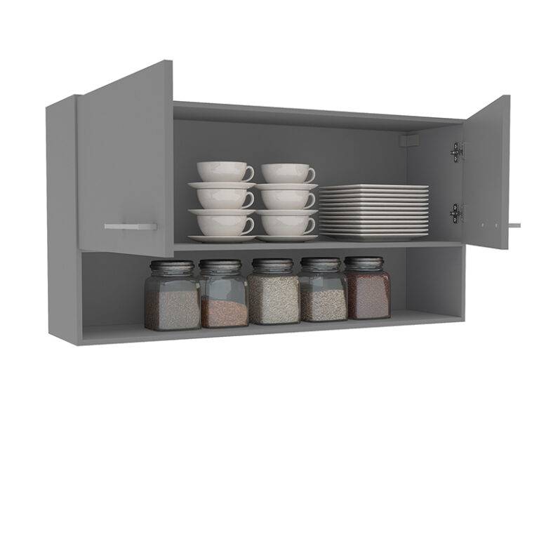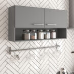 El armario colgante está fabricado en MDP en color y tiene 2 puertas para guardar accesorios de cocina o como despensa. También tiene un estante visible ideal como especiero. Es el mueble perfecto para completar la decoración y organización de tu cocina, además puedes combinar este modelo con el armario bajo.