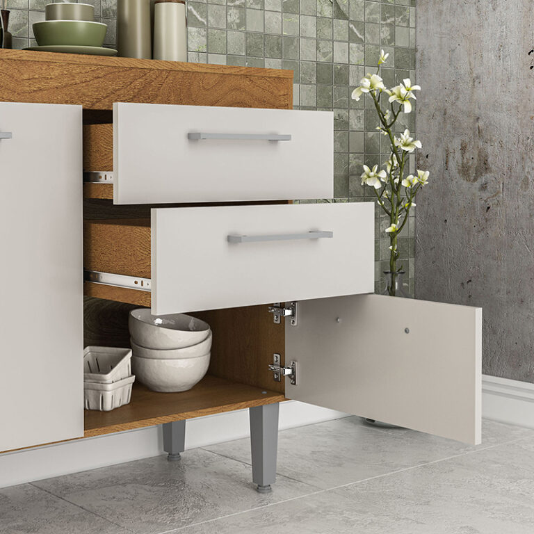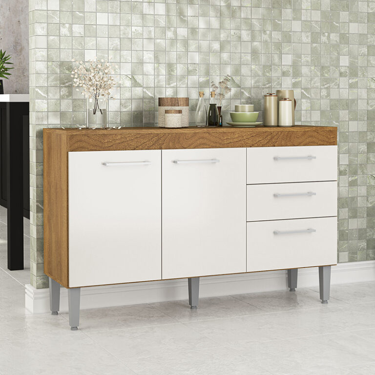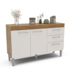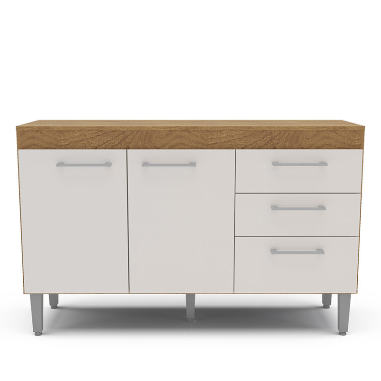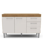 Mostrador fabricado en MDP en color freijó/blanco roto, dispone de 3 puertas y 2 cajones para guardar utensilios, pilas o accesorios de cocina. Es el mueble perfecto para completar la decoración y organización de tu cocina. También puedes combinar este modelo con el armario colgante.