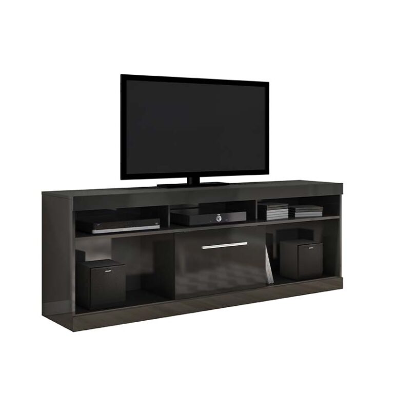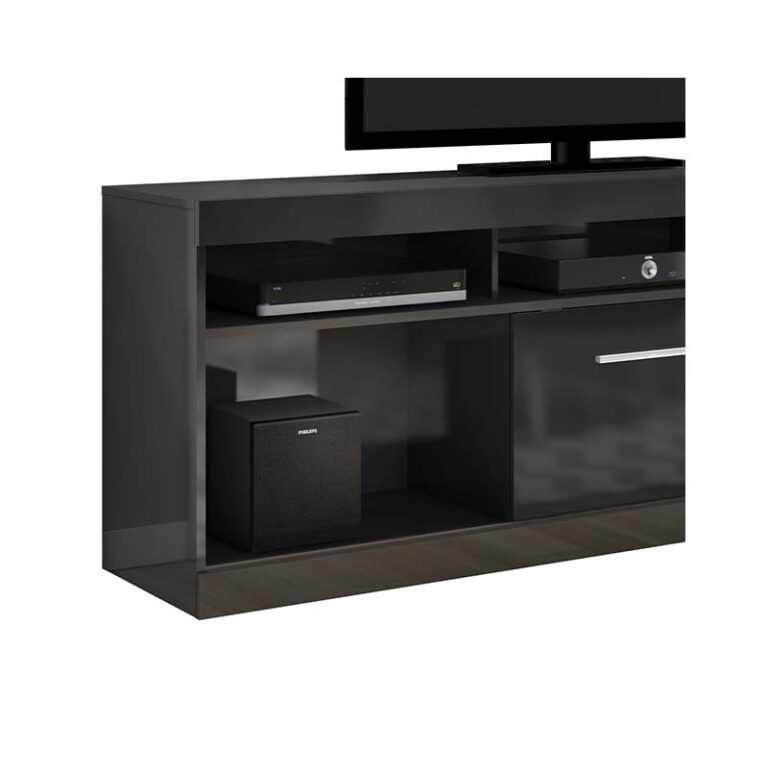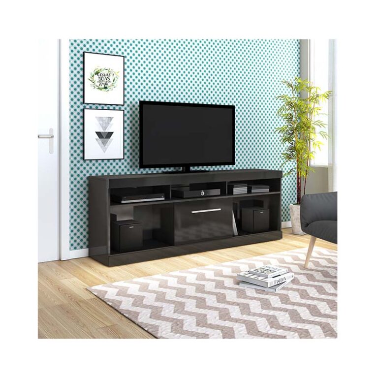 Rack Alma con capacidad de TV para 60 pulgadas; con puerta corredera; posee 3 compartimientos; trae 6 ruedas para facilitar el desplazamiento. Diseño nórdico; ideal para dar estilo moderno a tu Living o sala de estar.