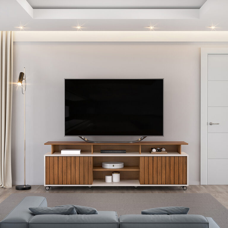 Su diseño clásico y su estructura de MDF/MDP le dan un toque de sofisticación a cualquier sala de estar. Con dos puertas, un estante y un compartimento para parlantes, este rack ofrece espacio de almacenamiento y organización para tus dispositivos electrónicos y accesorios.