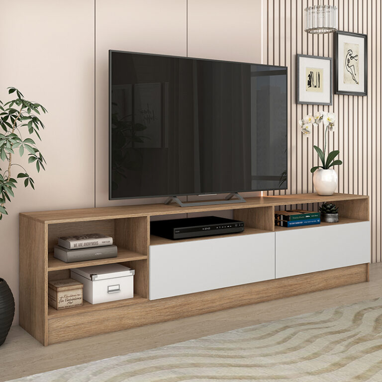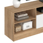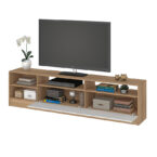 Rack Moyan de estructura en MDP con terminación en pintura UV de acabado símil madera. Capacidad para televisores de hasta 75″, posee 2 puertas abatibles y 4 compartimientos a la vista, para poder organizar todos tus complementos de tv y decoración para darle estilo y a tu sala de estar.