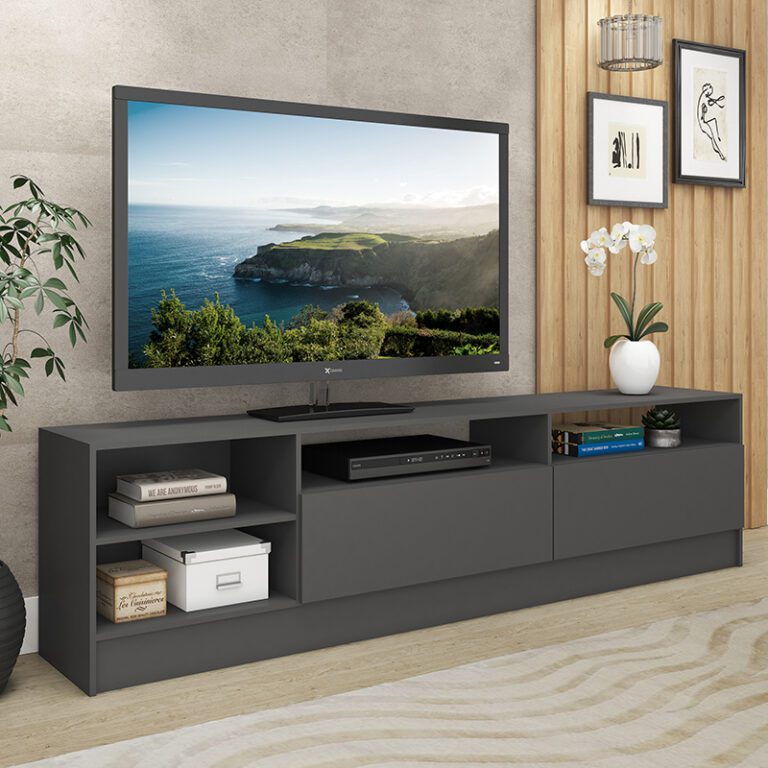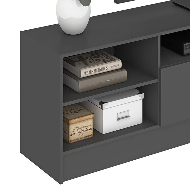 Con un ancho de 180 cm, este rack ofrece un amplio espacio para colocar tu televisor y otros elementos audiovisuales. Además, no cuenta con ruedas, lo que garantiza su estabilidad y seguridad.