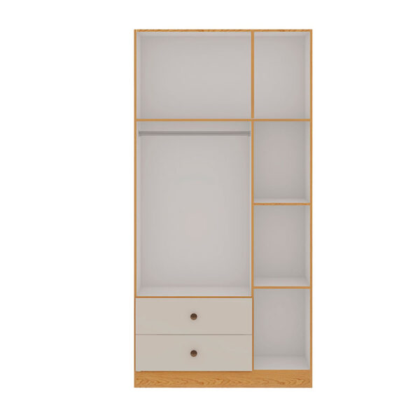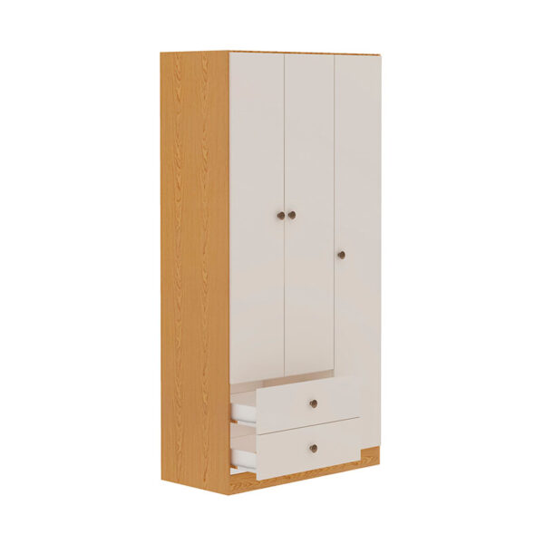 El closet cuenta con 3 puertas y 2 cajones inferiores, ofreciendo espacio suficiente para colgar prendas, organizar ropa doblada y guardar accesorios.