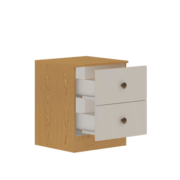 El velador complementa el set con 2 cajones funcionales, ideales para mantener objetos personales organizados junto a la cama.