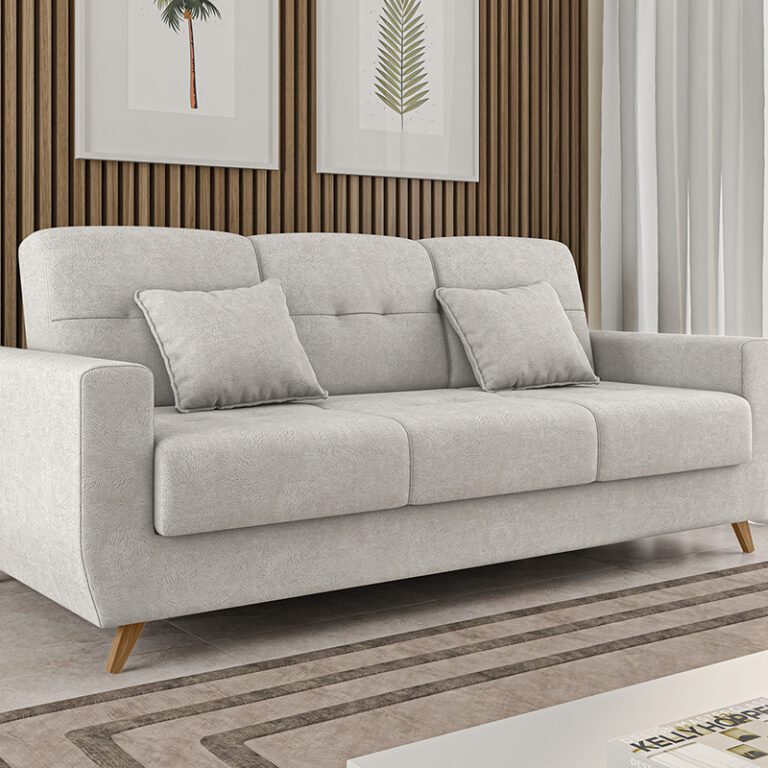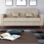 Sofá de tres cuerpos con estructura de madera contrachapada y relleno de espuma. Tapizado en tela color gris y sus patas de madera. Incluye dos cojines a juego. Es el sofá ideal para darle un look a cualquier ambiente de tu hogar.
