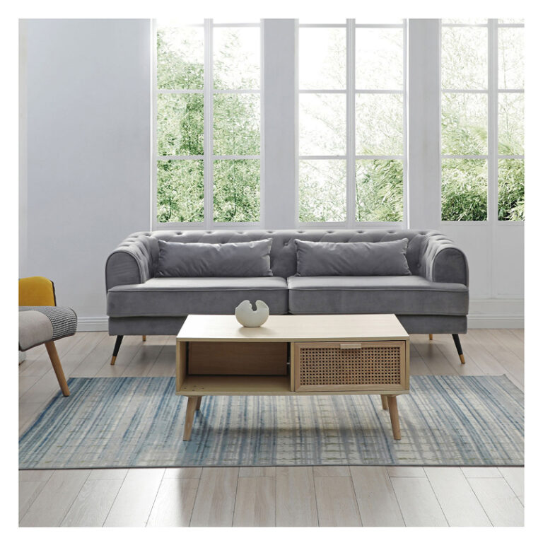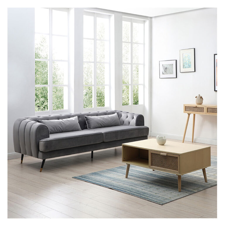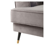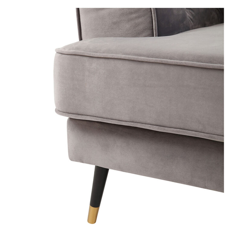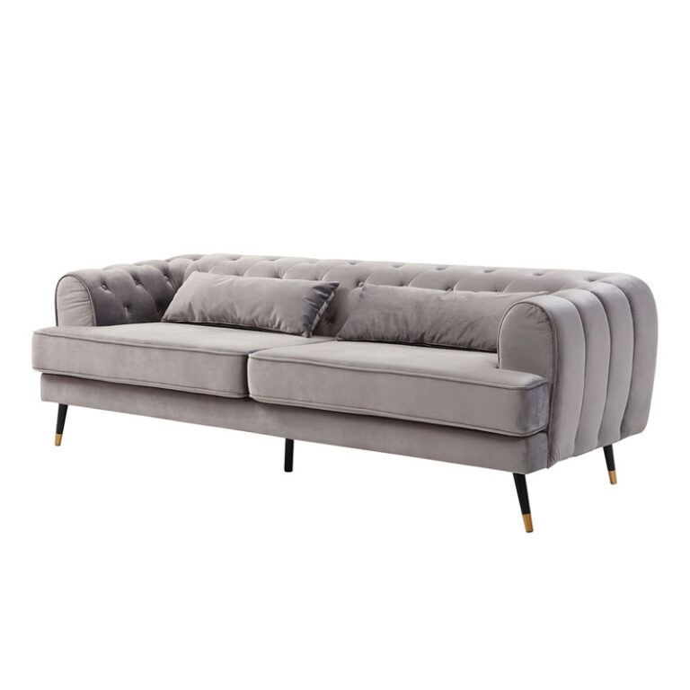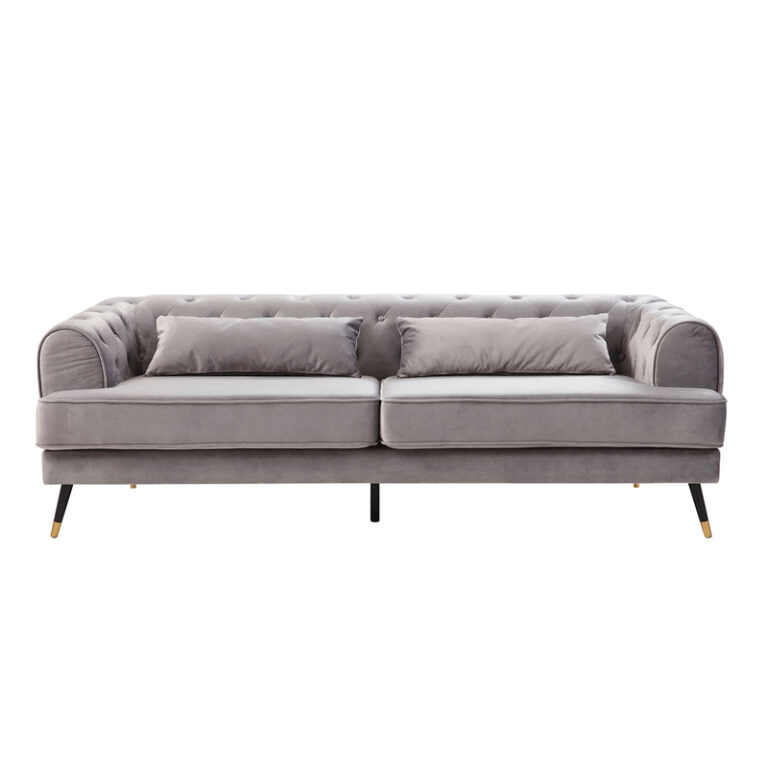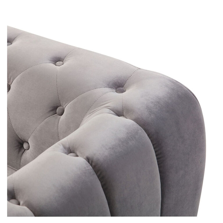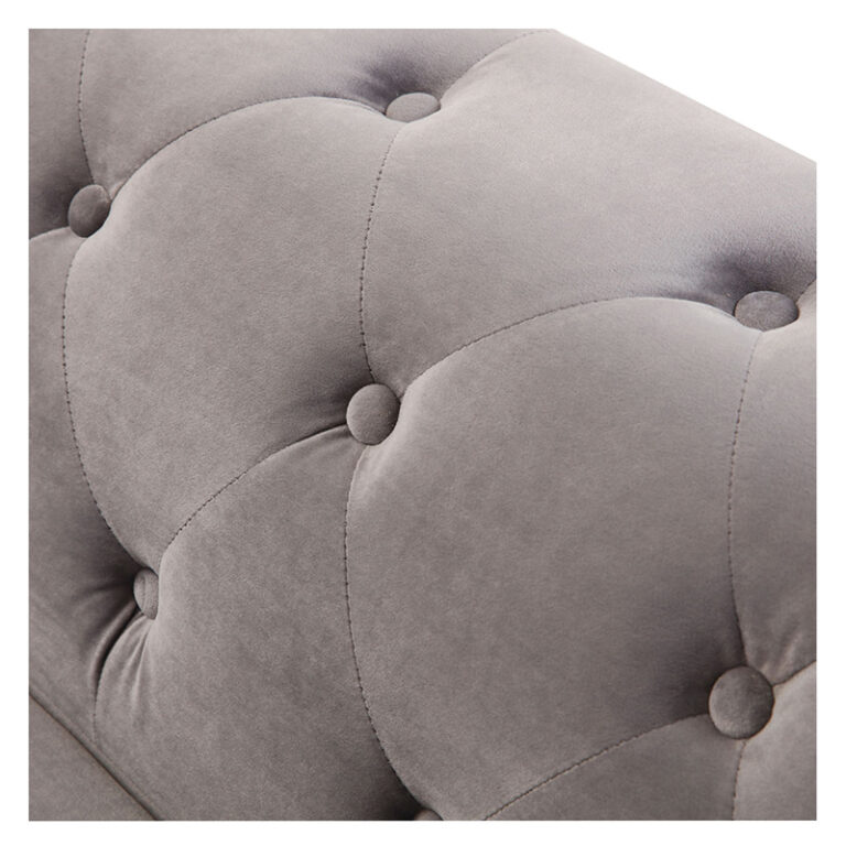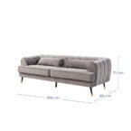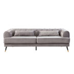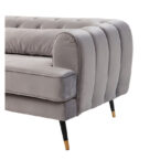 Amplio sofá de tres cuerpos con tapicería aterciopelada y patas metálicas. Su color gris y el detalle del capitoné en el respaldo junto con sus amplios brazos lo convierten en un sofá sofisticado, ideal para quienes buscan un estilo sobrio y elegante, fácil de combinar y que otorgue un máximo confort.