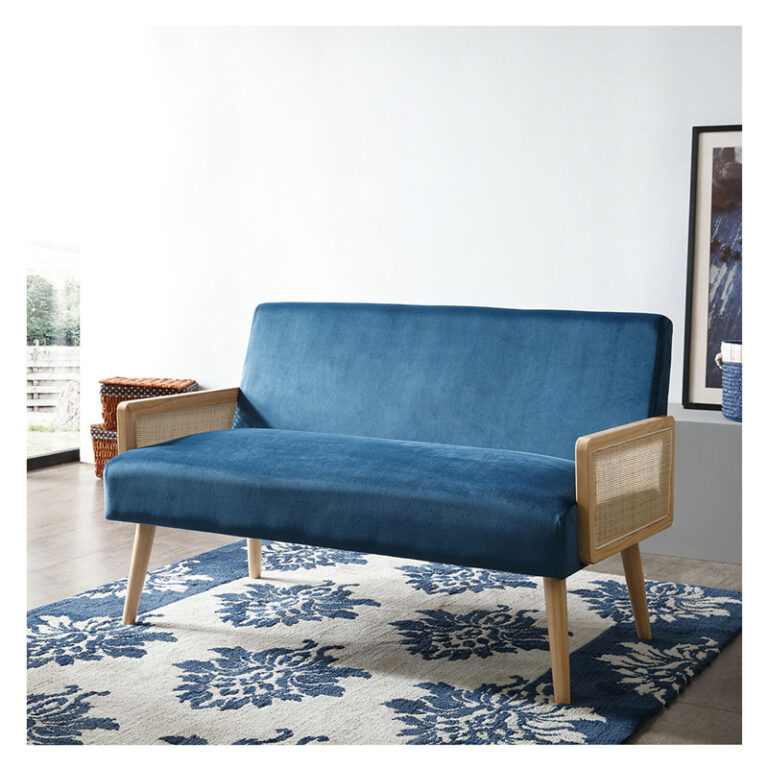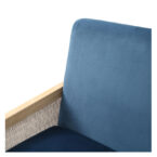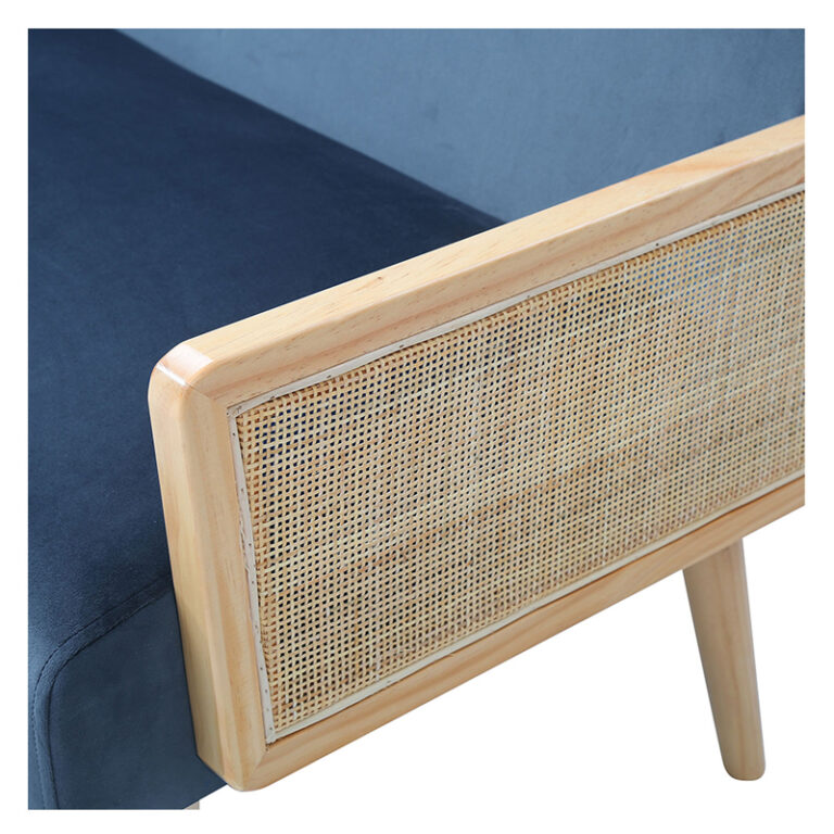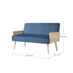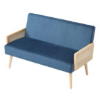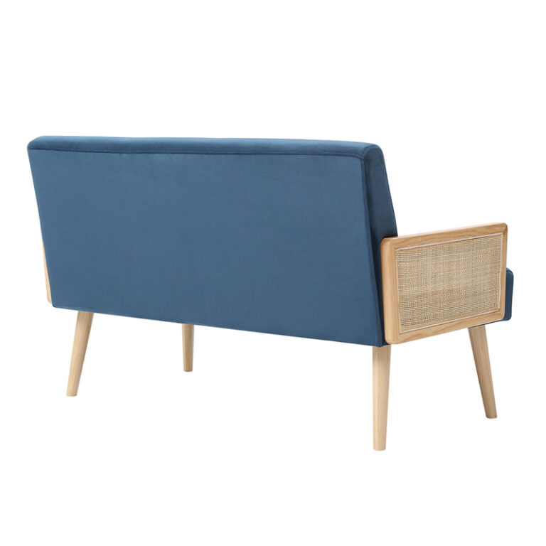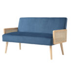 Sofá de dos cuerpos con estructura de madera de pino y contrachapada y tapiz de terciopelo azul. Posee dos apoyabrazos de madera con aplicación de ratán natural y relleno de espuma. Su combinación de texturas y color lo transformarán en el protagonista del living del hogar
