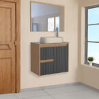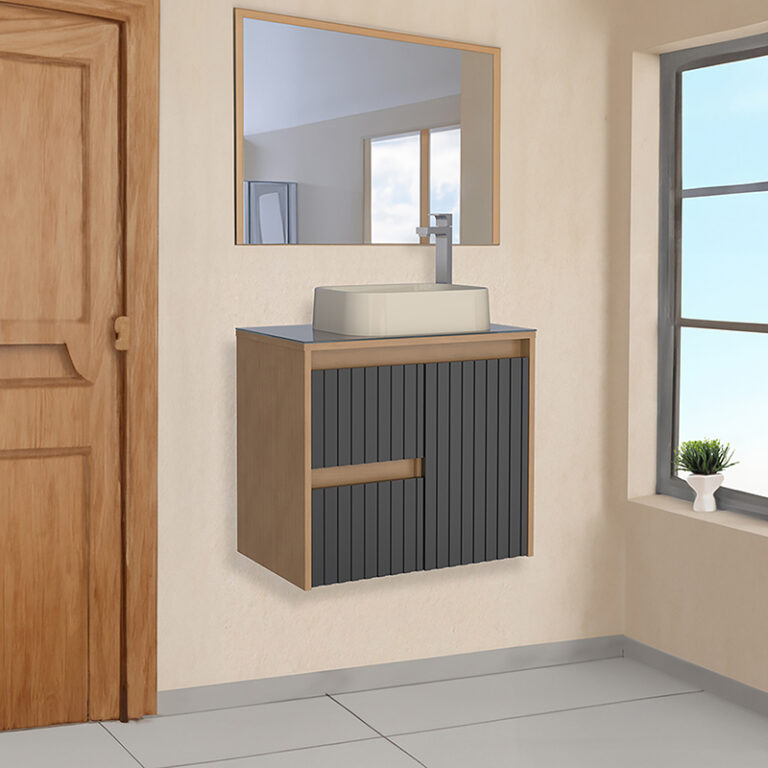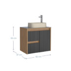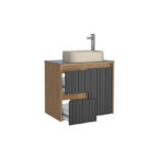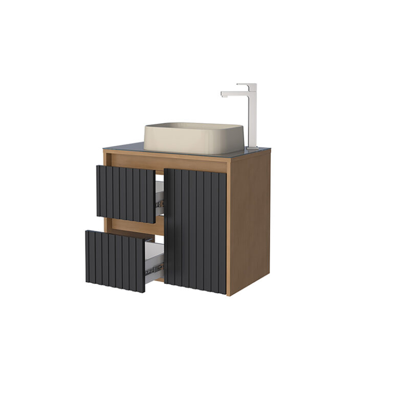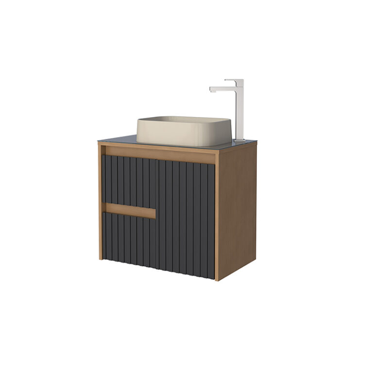 Mueble para baños KYOTO negro jequitibá con tapa de vidrio templado, lavamanos en mármol sintético LUNA de sobreponer, cajones con correderas telescópicas y puerta con cierre lento.