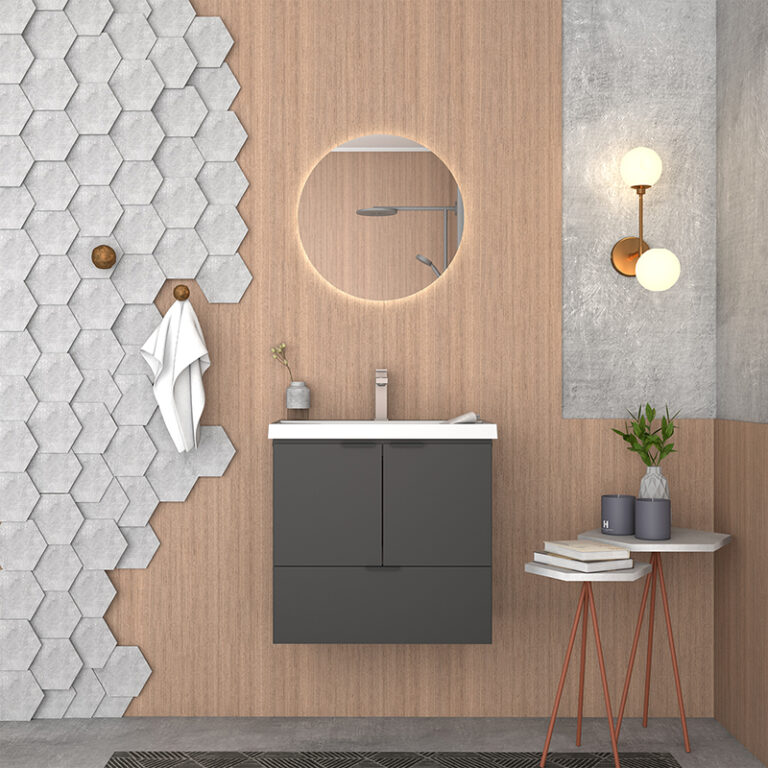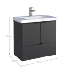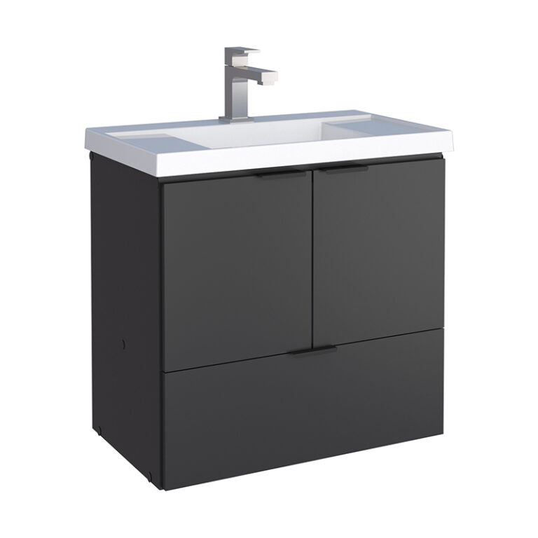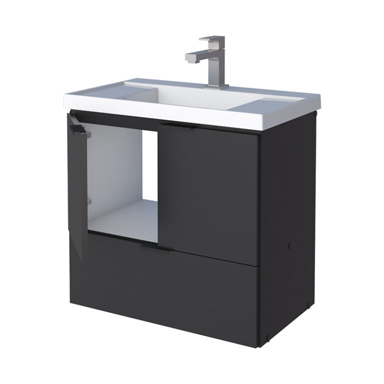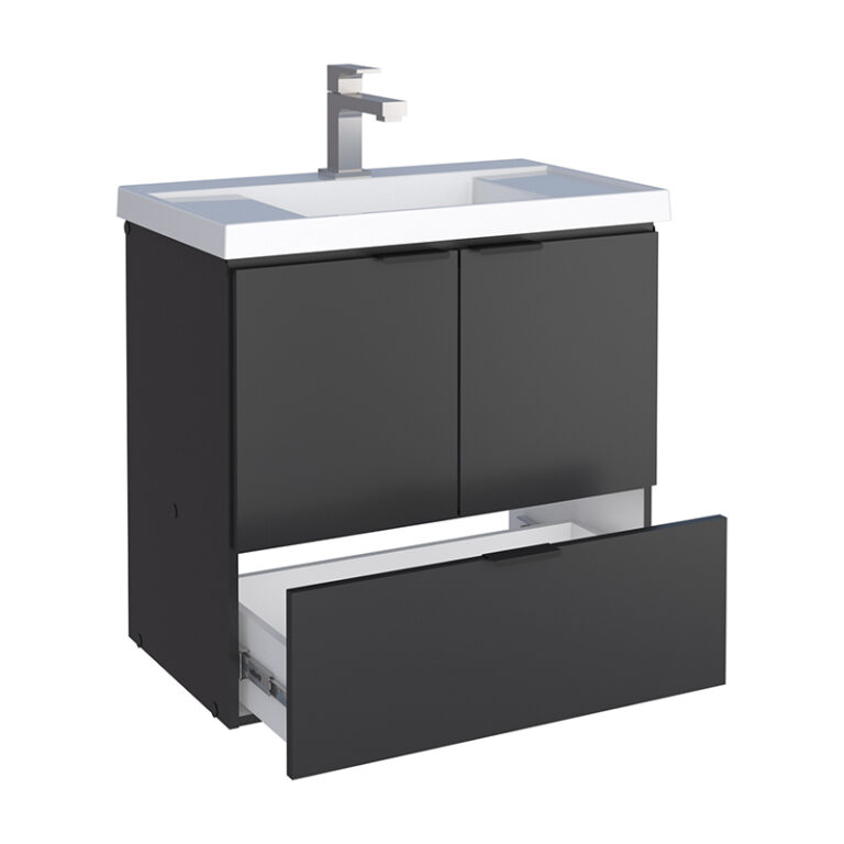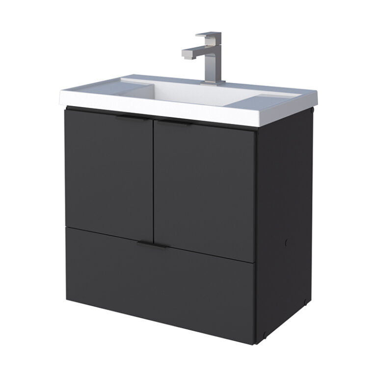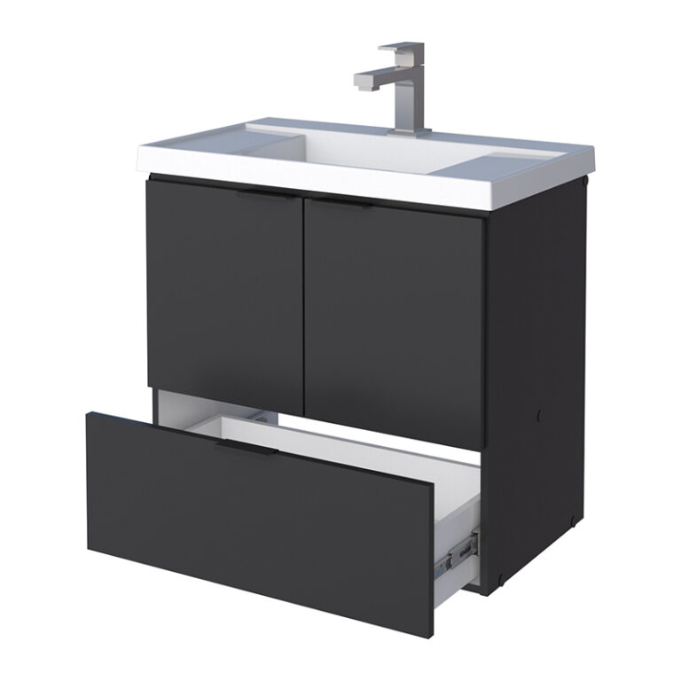 Mueble para baño LIS negro con lavamanos de mármol sintético, dos puertas con cierre lento y cajón con correderas telescópicas