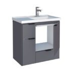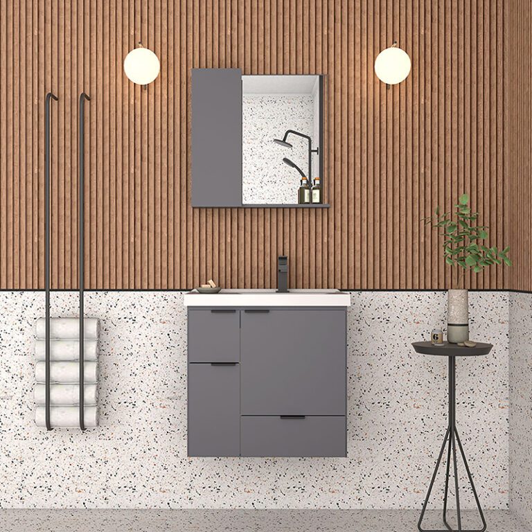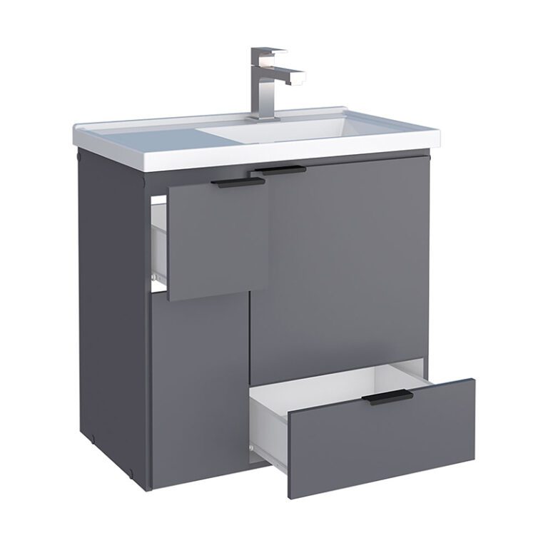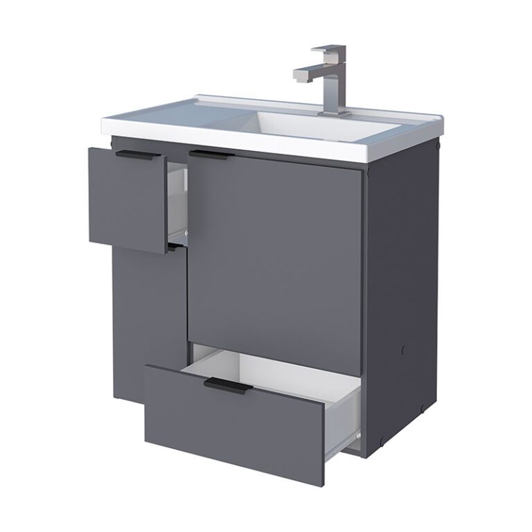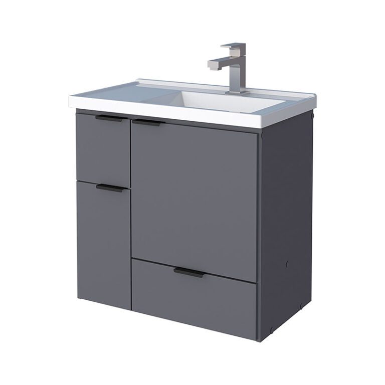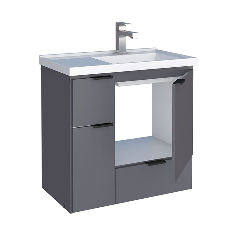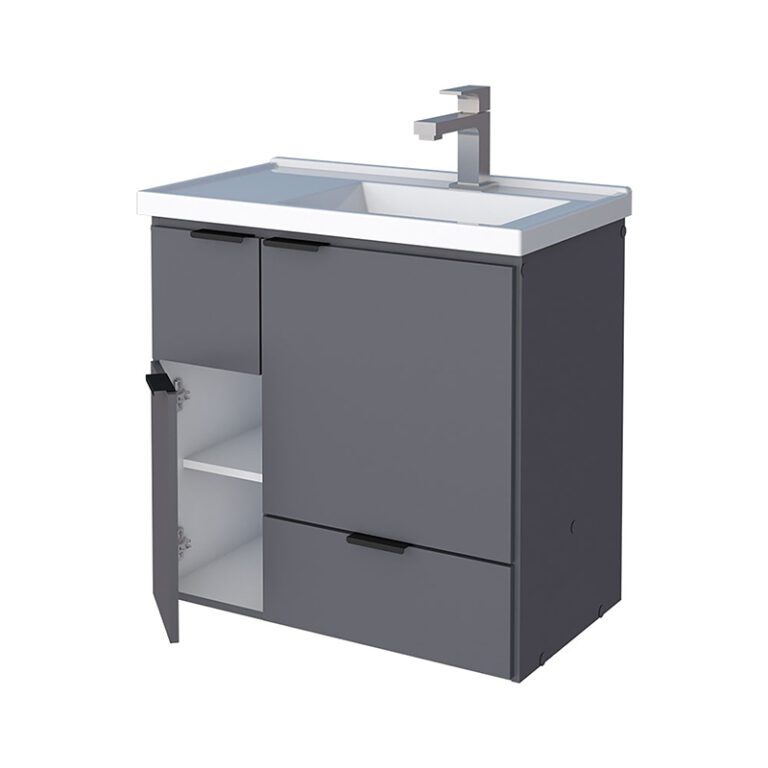 Mueble para baño ORQUIDEA gris con lavamanos de mármol sintético, 02 puertas y dos cajones con correderas telescópicas