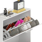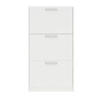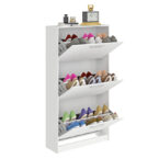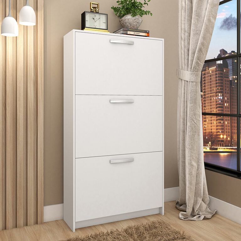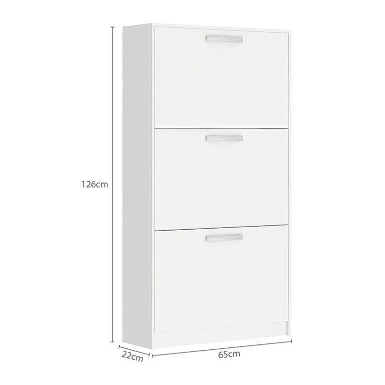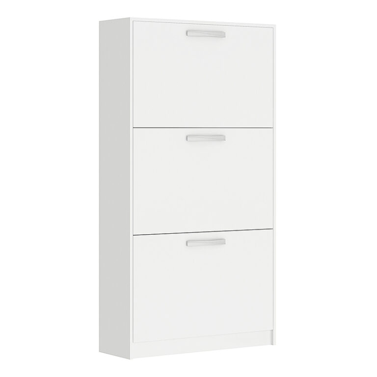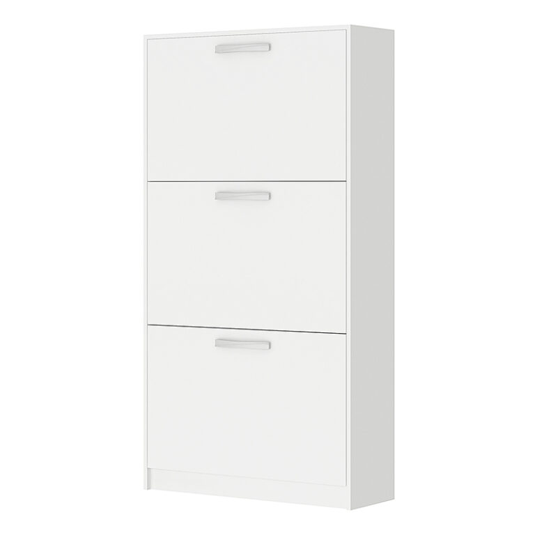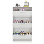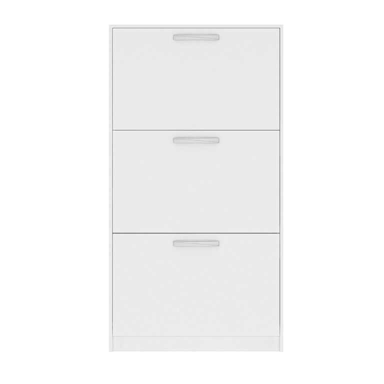 Zapatera fabricada en aglomerado MDP con acabado en pintura UV, imitación madera. Cuenta con 3 puertas levadizas, 1 separador interno y abanico interior. Capacidad para 18 pares de zapatos.