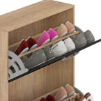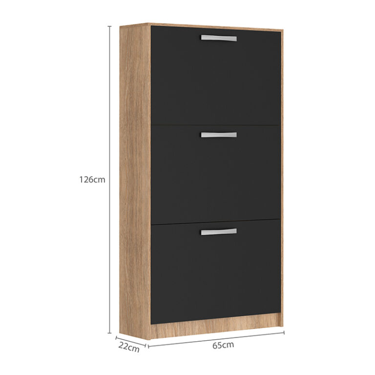 Zapatera fabricada en aglomerado MDP con terminación en pintura UV, símil madera. Posee 3 puertas levadizas con 1 separador interno y abanico interior. Capacidad para 18 pares de zapatos